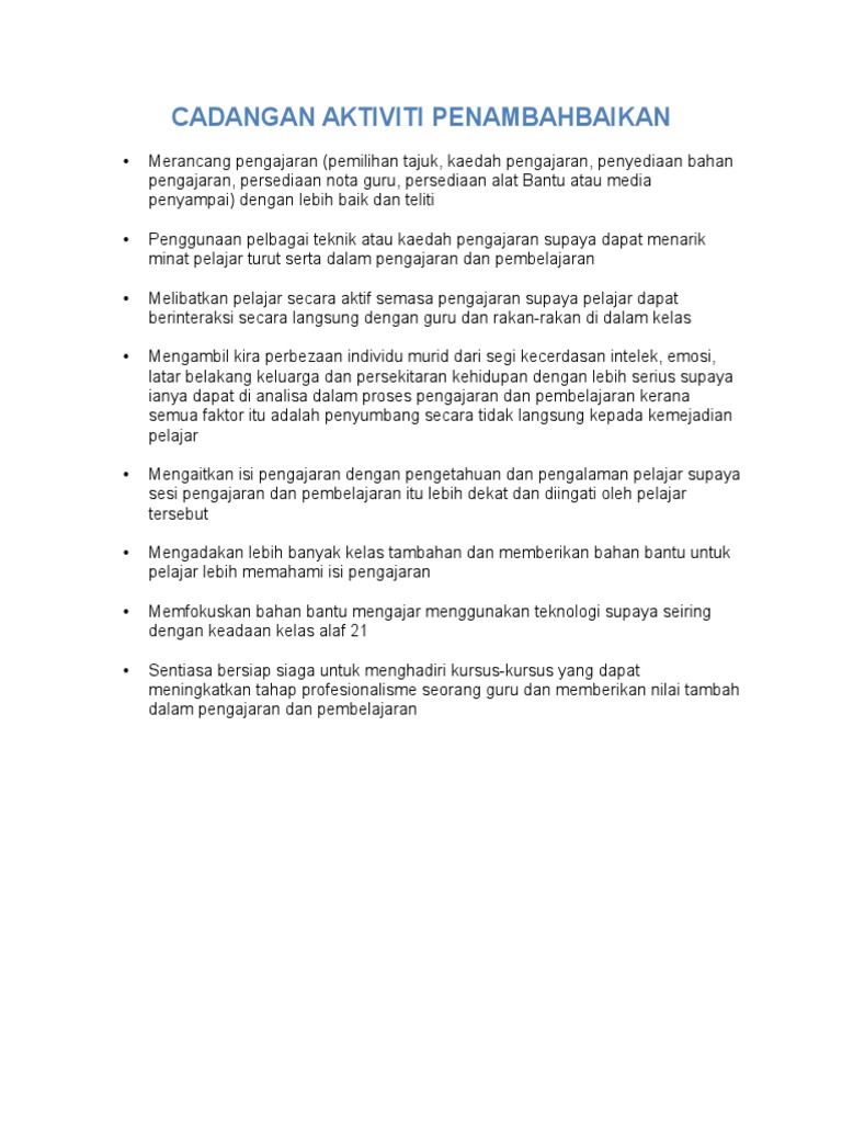 Click here to create your own form. Terdapat beberapa cara yang boleh dilakukan untuk memperbaiki sistem pengangkutan awam di malaysia berdasarkan masalah. Adakah transformational, transactional atau laissez faire cadangan penambahbaikan sistem membangunkan satu sistem aduan/ cadangan yang padu bagi mempertingkatkan kecekapan dan sistem tadbir urus di um. Segala cadangan & luahan berkaitan sistem pendidikan negara hendaklah ditulis dengan ayat yang teratur menggunakan bahasa yang baik dan baku. 1 cadangan penambahbaikan sepanjang saya menjalankan inovasi kepada murid tahun tiga ini, masih banyak perkara yang perlu saya titikberatkan.