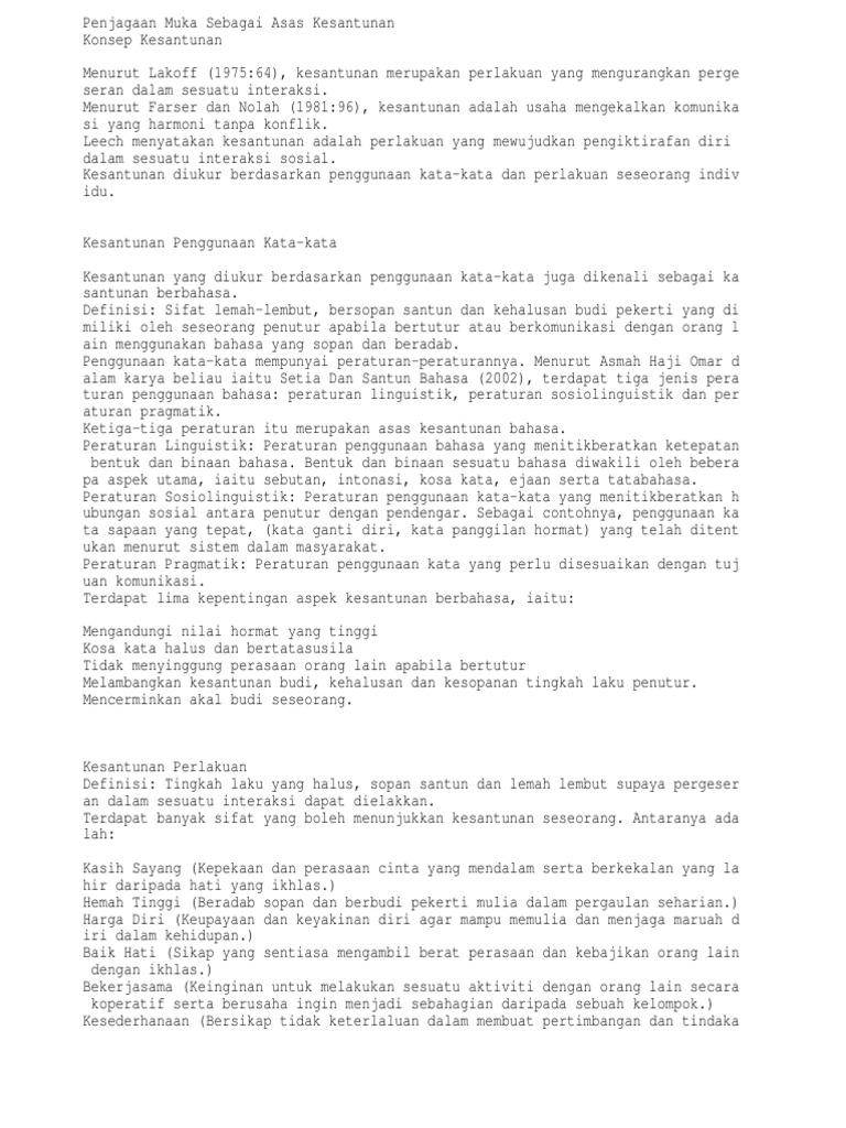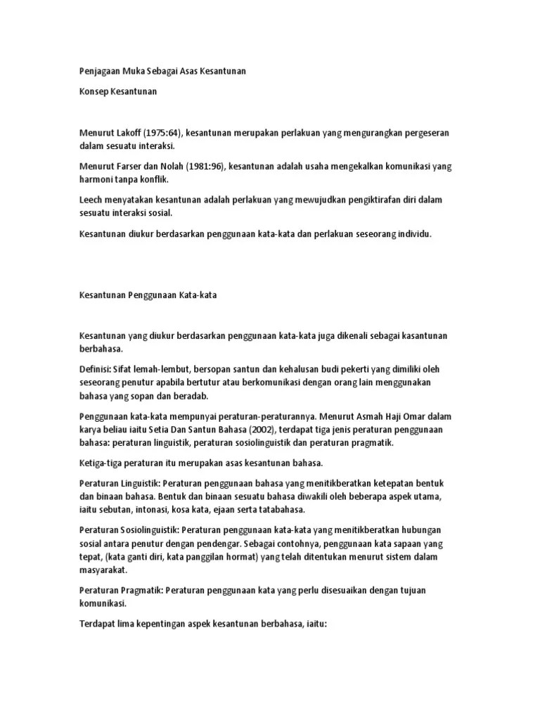 Asmah, 2000 = muka dalam masyarakat melayu merujuk kepada air muka. Justeru, kesantunan merupakan usaha untuk mengekalkan komunikasi yang harmoni tanpa konflik. Perasaan yang mendesak seseorang supaya. 0 ratings0% found this document useful (0 votes). Penjagaan muka sebagai asas kesantunan.pdf (114975).