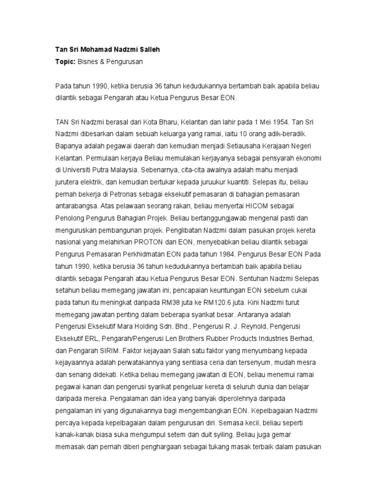 The recipient of this award receives the title tan sri and his wife puan sri. Bin mohammed salleh received an undergraduate degree from the ohio university and a graduate degree from the university of miami. And chief executive officer at edaran otomobil nasional bhd. Pada oktober 1996, proton melalui tan sri yahaya telah mengambil kawalan terhadap lotus sebelum ianya diambil alih oleh pengarah urusan, datuk mohd nadzmi mohd salleh dengan tengku mahleel. Datuk seri mohd nadzmi salleh berasal dari kota bharu, kelantan dan lahir pada 1 mei 1954. Mohd nadzmi bin mohd salleh. Dato' nadzmi graduated with master of arts in economics and statistics from miami university, florida as well as bachelor degree in arts in economics and bachelor degree in. Proton can expect a warm response from the public as the price of all lotus models has been markedly reduced. See mohd nadzmi bin mohd salleh's compensation, career history, education, & memberships. Bapanya adalah pegawai daerah dan kemudian menjadi setiausaha kerajaan negeri kelantan. Mohammed nadzmi bin mohammed salleh. This award was limited to 250 living recipients only at any time, excluding foreign citizens who receive it as an honorary award. The entrepreneur development ministry today announced the sacking of tan sri shukry mohd salleh as chairman of bank rakyat's board of directors with immediate effect.